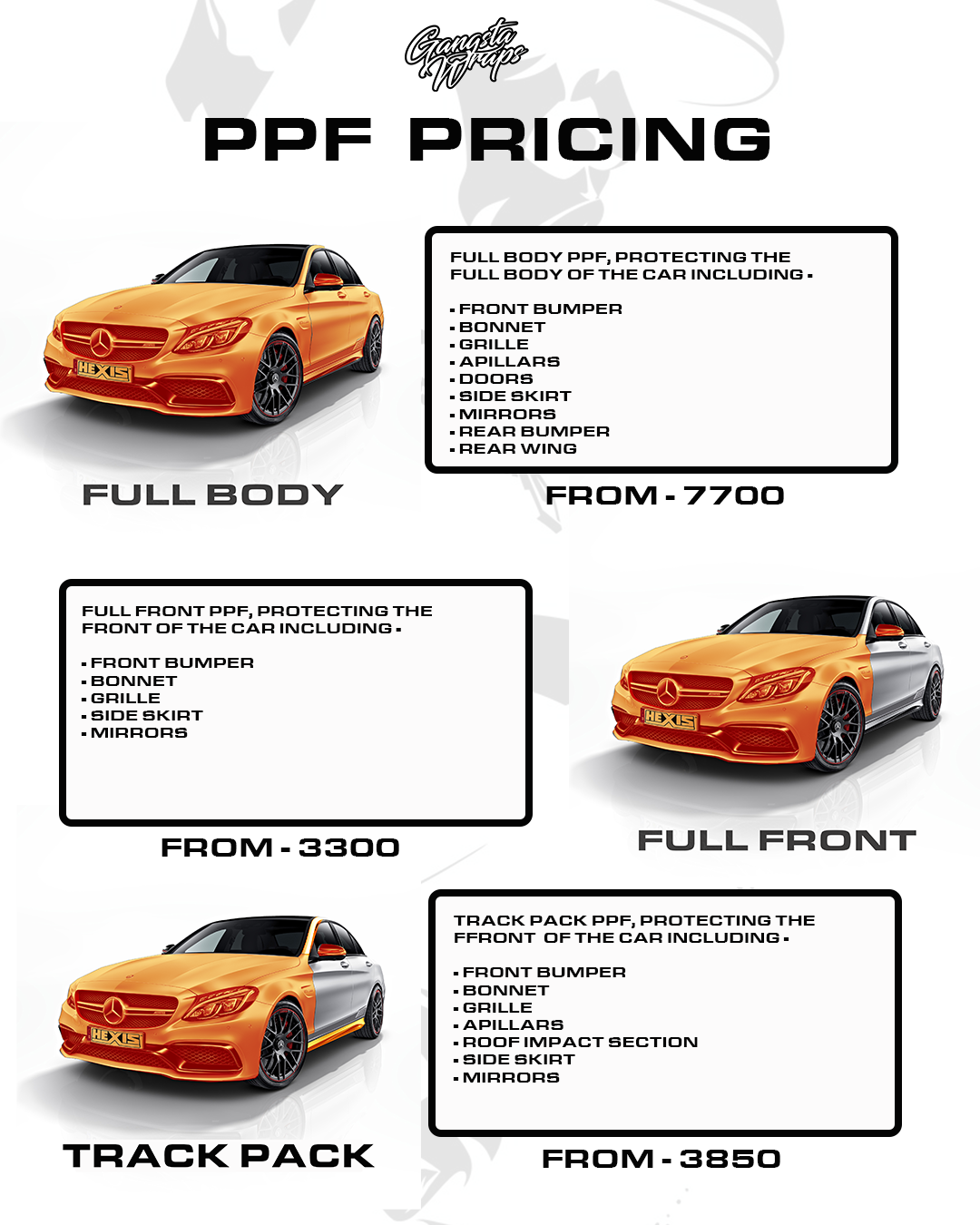 Paint Protection Film has come a long way over the last decade and Gangsta Wraps has the latest most cutting edge films available on the market. We use Hexis, Stek, GSWF and Suntek.